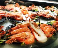 We marveled at the big tuna in the sashimi area--only line-caught, immediately chilled tuna can be sold as sashimi (or sushi) grade. The reason is that net-caught fish often sit on the deck of the boat for 3 hours or more as they are graded and sorted before going into the hold. Bacteria start to grow quickly in fish, so the fish is not as fresh as line-caught which can come off the hook and onto ice in less than a minute. Bluefin tuna, which may be put on the endangered species list due to overfishing, is the favored raw fish of the Japanese. It is so in demand, and now so rare, that a single bluefin can fetch upwards of $170,000. Bluefin fishermen usually have a helicopter ready to transport the fish immediately to the nearest airport where it is shipped on ice to the Tokyo Fish Market, where it arrives within 24 hours of being hauled in. Fortunately, there was sustainably harvested seafood available in the Markets' retail area and we had a seafood feast for breakfast.